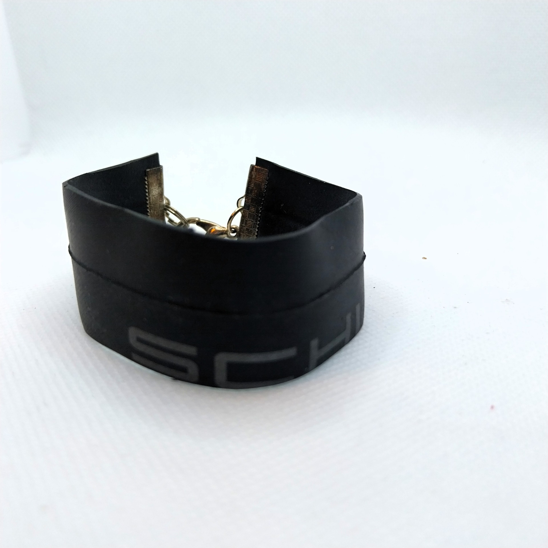 Een deel van de gestempelde tekst van de fietsband staat nog op het armbandje